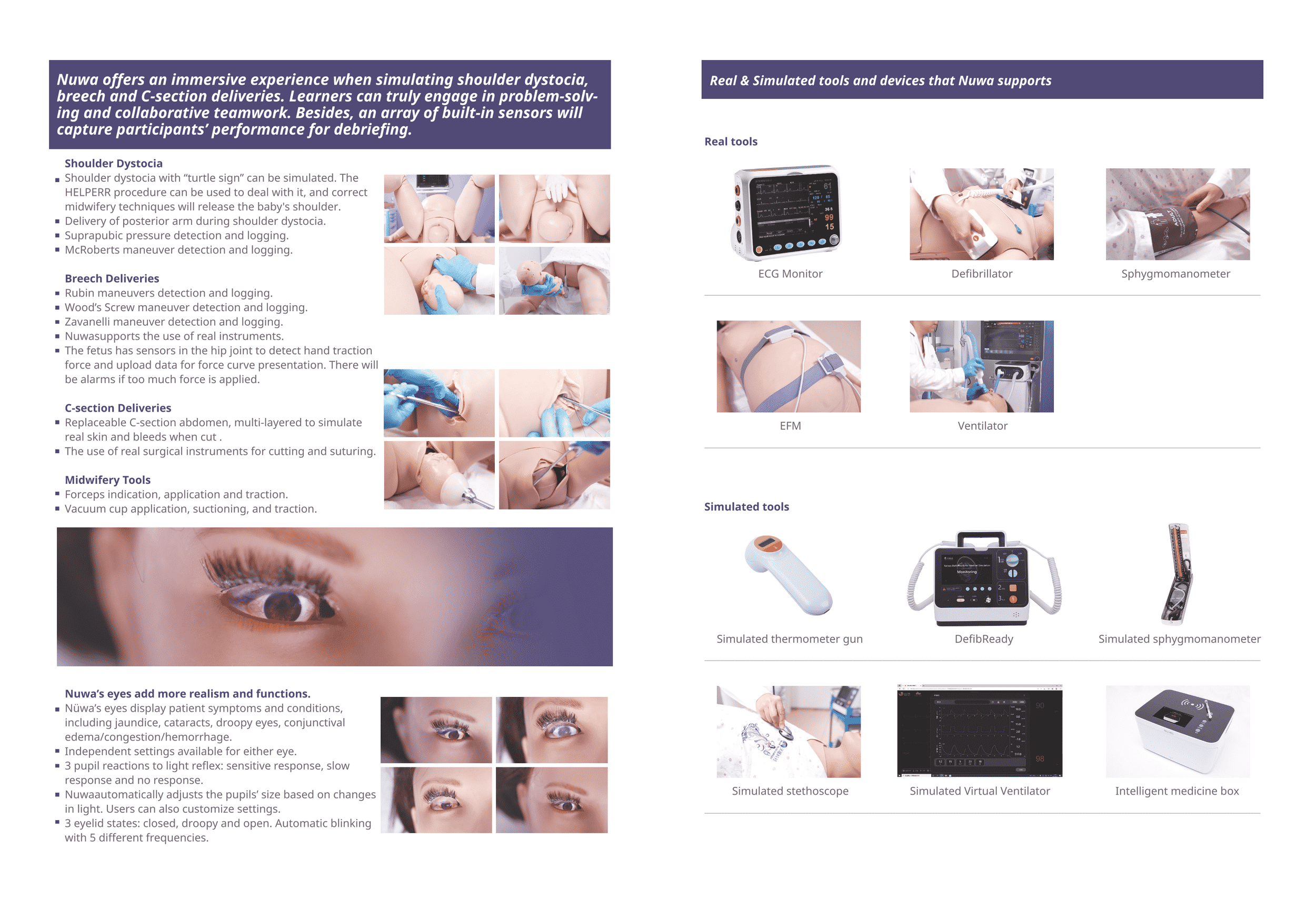 Nuwa-the Birthing Simulator is designed to meet the training needs of obstetricians and midwives. Featured with real-time smart control, automatic delivery, difficult labor and easy operation, it’s for all aspects of childbirth, before, during and after.